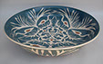 To create the winter series of platters, I select plants that are flexible and show detail when pressed into a slab. I apply layers of different slips, put the slab design-side down on a hump mold and build or wheel-throw a foot on what will be the bottom of the platter. After bisque, I apply and remove layers of varying oxides, apply glaze and re to cone 10 in a reduction atmosphere.