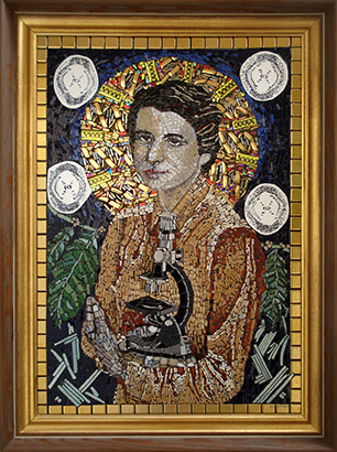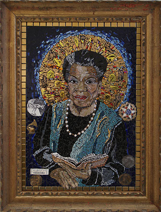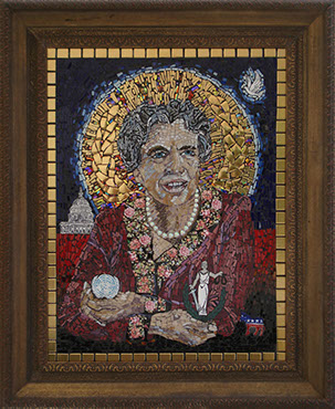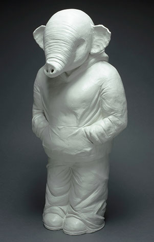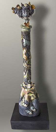 The emotionally esoteric Soul Circus by Gina M. and Deirdre Sullivan-Beeman, represents humanity’s naïveté and mystical qualities. The elephant (the mystical) offers protection and holds the innocent young girl (naïveté) “tight as a drum” in his belly as the chaos of life ensues. The piece combines modern day ceramics with traditional oil and egg tempera painting techniques.