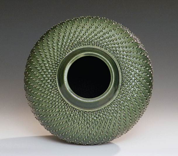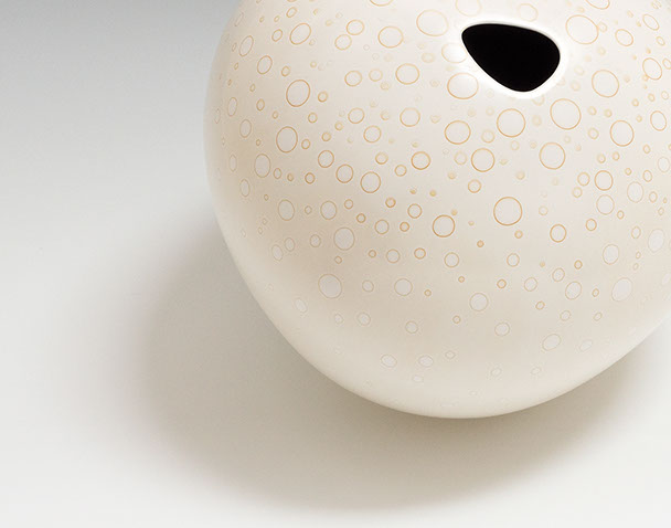 The pattern of circles is created by the interaction of soluble metal watercolor solutions which I paint onto the bisque-fired clay. (The metallic watercolor solutions are can be likened to ink on clay.) These watercolors spread, interact, and diffuse through the clay medium. The final firing transforms this pattern into a permanent surface without the use of any traditional ceramic glaze.