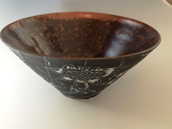I learned clay in LA working in porcelain with freehand incising on slip, applying glaze only inside. The ring is cone 10. The sunflowers celebrate our connection with nature.