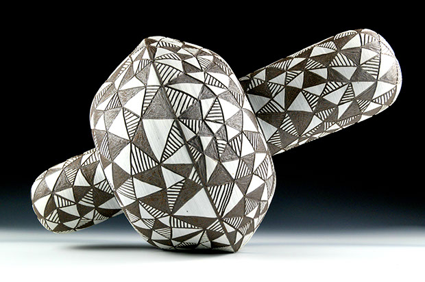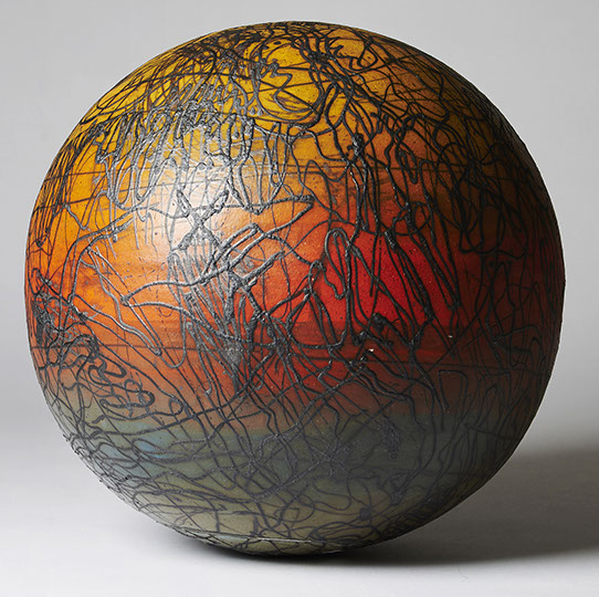 Building large spheres out of clay and keeping them round is very challenging. Decorating them is an absolute delight. Each mark, brush stroke or clay addition sets up a dynamic space design that must be considered and manipulated by rotation in order to encompass the whole form. Ultimately, all the design elements are connected without any limitations imposed by borders.