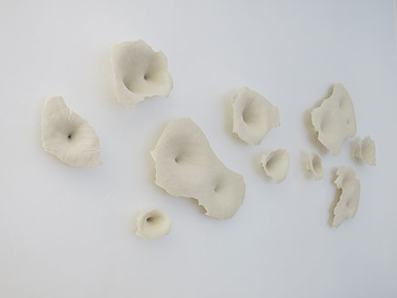 The current body of work, collectively called The Floating World, imagines dreamy, abstract landscapes and crafted from porcelain slip. Like the movements of molten lava hardening into stone, the clay body forms contours which also shrink, slump, and crack before reaching their final form at the end of the fire. They are not created with any particularities in mind, but instead wait for a name and a story around the studio. Lands that have not been discovered yet.