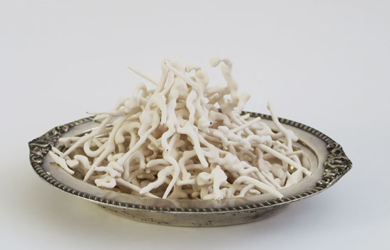 I like that all of these forms are basically created from one strand and that one string can become a shape that has so many different associations. Our bodies: skin, fat, and bone, sex, food, and fetishistic attachments–these are my thoughts while working.