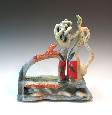 I sketch many of my ideas before I build them, coming up with titles that will hopefully get the idea across to the viewer. Sometimes the titles are unnecessary, as the viewer can recognize what is going on in the scene, or even make up their own interpretation. I typically build my figures from the ground up, using coils of clay and forming, cutting and paddling the form as I work my way up the figure. The pieces are finished with glazes, underglazes and stains, which I sponge or brush on in layers, building up color and texture. My favorite firing method is Raku, which imparts a beautiful smoky and somewhat unpredictable surface that ties the colors together well.