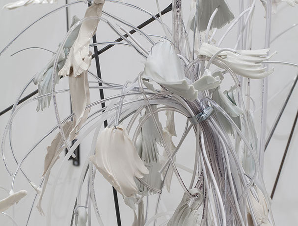 The soft sculpture is further transformed into a rigid structure after soaking in porcelain casting slip, and then ring. The ring leaves a vitreous ‘relic’ of its past, much like the coral we collect on beaches is a skeleton of the living creature that once grew under the sea.