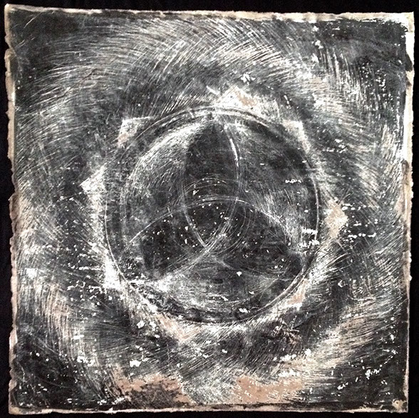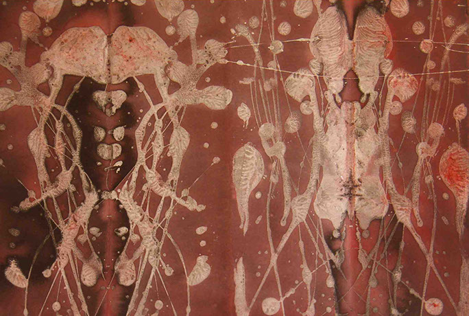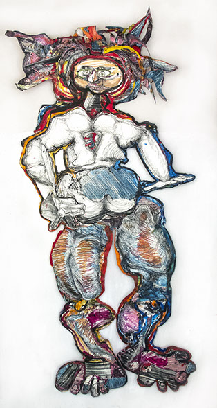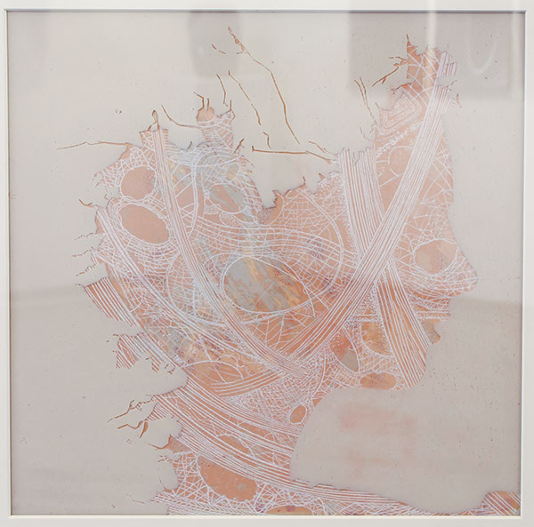 Abstract curvilinear shapes carve-out a rocklike three-dimensionality in my pieces. Rich colors in acrylic paint and India ink conflict with the areas that are translucent, allowing marks and textures to come through.