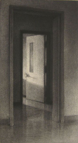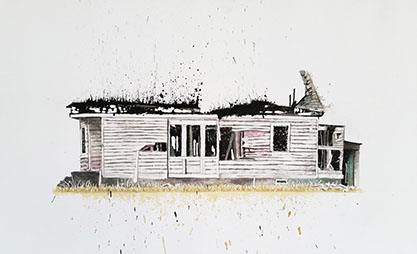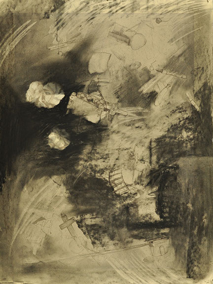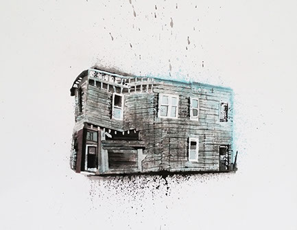 I moved to Detroit in 2009 to join the faculty of Wayne State University. I found, not only Detroit, but the Mid-West in general, to be full of unfamiliar sights and sounds. I was also confronted by the architectural decay that was, initially, frightening. I began to draw these skeletons of buildings to familiarize myself with my new environment. Through drawing, I learn to understand new information. I internalize it and know it in a way that transforms it into something familiar and less frightening. These drawings are fairly large but they are intimate studies of my neighborhood as I become familiar with it. You could say that I am drawing close to Detroit. I have titled the series Frontline: Detroit because I still begin my drawings with ‘snap lines’. I use them to find the main compositional and architectural lines to anchor the drawing.