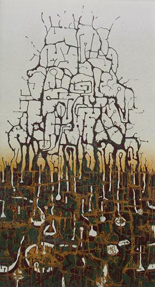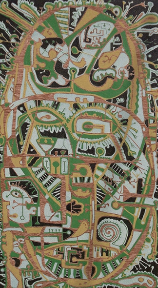 Much of my work is based on my early training and experience as an archaeologist and anthropologist. I have liberally abstracted symbols used by anthropologists to describe culture. I also draw heavily from received information about contemporary culture including aerial drawings, biology, technology and of course art history.