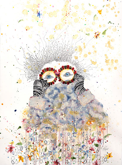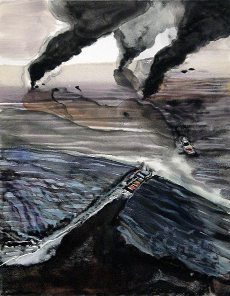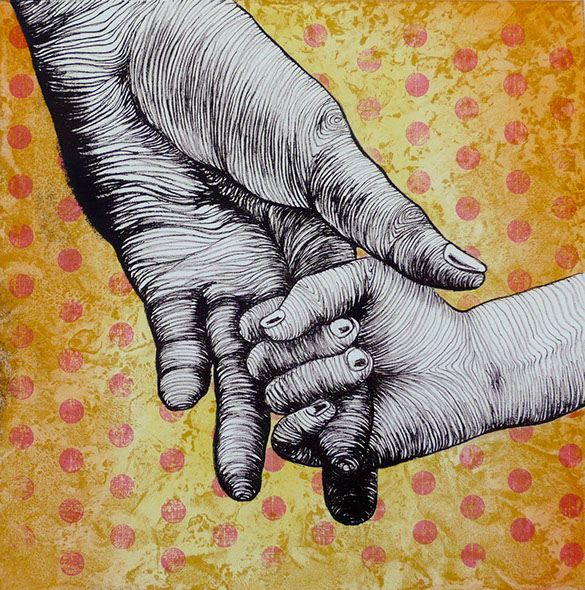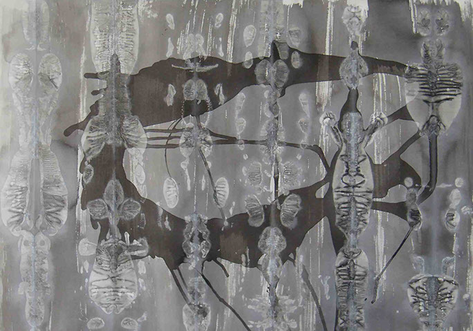 This is my first recollection: a fascination with the juxtaposition of situation and parts. This has continued to expresses itself in my art. This work explores the disconnectedness of my thoughts—so I like pushing and pulling the tension using ink and paint…I create the cause of the risk within the 'watching the paint dry' —anticipation.