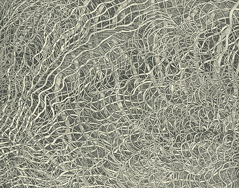 I have been exploring the essence of the drawn mark as a parallel for the most basic of thought processes, the firing of synapses. A drawn line forms a connection between two points, just as our thoughts are the paths between a set of neurons. In the creation of these pieces I work spontaneously, developing an increasingly complex web of systems in the process. Each mark is affected by multiple, interlocking systems and forces that grow out of the ongoing, subconscious process of mark-making.
