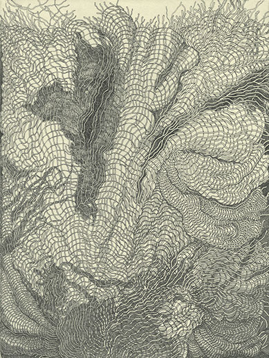 We live in an age where words, images and objects seem to have been looted of meaning. In response to this state of affairs, I have come to think of the etchings I make as being miniature Rorschachs, the reverberations of oneiric gunshots acting upon the experiences and senses of the unsuspecting viewer, as well as the artist. Where do my ideas come from? The same place as everyone else’s—the brain. Or more precisely, they come from the interaction between experience and imagination that takes place within the brain, and I tend to think of my discovery of images in terms of receptivity rather than “inspiration” or “creativity”. If anything, my intent in pursuing a carefully worked out and highly detailed image is to work towards an inward goal unbounded by a set beginning or end, rather than trying to make some inner vision tangible. Even a simple nursery rhyme, once you start picking at it, will reveal layer upon layer of associations and further meanings. I consider my work successful to the extent that it continues to generate multiple interpretations, releasing this capacity for receptivity to the mysterious and the ambivalent that reflects the essential vibrancy of life.