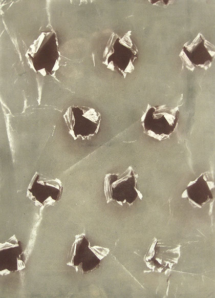 Dark Money is produced with silkscreen ink and aerosol paint on paper. The images are screen-printed with black silkscreen ink backwards on paper. The printed side of the sheet is painted with an aerosol can to various degree and position. The unprinted and unpainted side of the sheet reveals the paint bleeding through the paper where the screen printing didn’t block it out. Individual pieces are arranged and mounted to board.