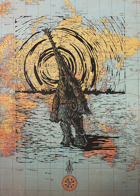 In Herr Strohmann, the figure refers to the strawman that has appeared in a variety of incarnations: in the folklore of numerous cultures, including Estonia in the 17th century, Croatia, Germany and Ireland, among others. This figure was often used to represent luck, both good and bad, harvests, winter and even death. In this relief print, I have placed the strawman image on a reproduction of an old map, with a blazing sun behind the figure to suggest the inevitable dominance of nature.