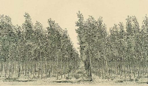Over the past fifteen years my work has addressed the fragility of the landscape, whether it is the Nevada proving grounds, deep-sea terrain, reclamation areas, corporate agriculture, or Taiwan urban gardens. And now with the planting and harvesting of trees as a way of looking at the resurrection of the previously blighted or the implications of the unpredictable, the work has become more subtle, in black and white relief prints, Sumi-ink drawings, hybrid digital/relief prints, and carbon prints on Japanese papers. Ink, paper, photographic and specialty materials, and software applications combine to elicit a response that is not immediately obvious, finding kinship among materials and subject.