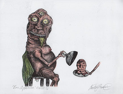 Bone Appetite was created using the technique of offset printing and includes a total of eight prints, with this being one of two in the third edition. This illustration is limited in the amount of images produced and future prints will not be created due to the fact that the plate was destroyed because of the improper application of gum arabic. As a child I grew up helping my grandmother in her newspaper company, Miller Printing and Design in Shallotte, North Carolina, and had the opportunity to be exposed to various printing machinery on a commercial level. Because I am still a novice in this field, while learning how to use a plate maker I encountered small errors which ultimately resulted in the later destruction of the plate as previously mentioned.